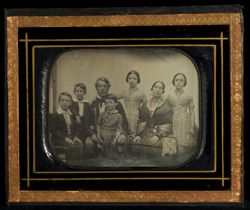Ehepaar mit ihren sieben Kindern, zwei Mädchen in gepunkteten Kleidern bei der Mutter stehend, drei Jungen bei dem Vater sitzend.