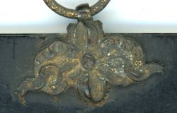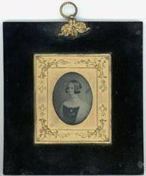 Head and shoulders portrait of a woman. She wears a dark dress with a ribbon and brooch on the front and a light pale shawl. Her hair is dressed in bangs at the side of her face. She has on a gold necklace. Gold highlights.