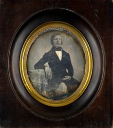 Portrait de jeune homme, à mi-genoux, assis, de trois-quarts à gauche, l'avant-bras droit reposant sur une table