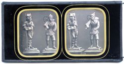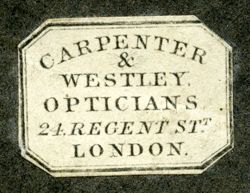 Die hier vorgestellte Stereodaguerreotypie mit der Aufnahme zweier Skulpturen ist mit sehr großer Wahrscheinlichkeit in England entstanden. Rückseitig trägt sie das Label eines Londoner Händlers: „CARPENTER / & / WESTLEY, / OPTICIANS / 24, REGENT STT. / LONDON.“ Eigentlich war diese Firma ein renommierter Produzent von optischen und wissenschaftlichen Geräten, der bereits 1818 von Philip Carpenter (1776-1833) in Birmingham gegründet wurde. Nach Carpenters Tod leitete eine Zeit lang seine Schwester das Unternehmen, bis dann der ehemalige Lehrling William Westley 1835 mit einstieg. Carpenter & Westley waren u.a. die Hersteller der Brewsterschen Kaleidoskope und leisteten wichtige Beiträge im Bereich der Entwicklung von magischen Laternen. In den 1850er Jahren verlegte man sich zunehmend auf den Handel, worunter auch die beliebten Stereodaguerreotypien fielen. Diese kamen in der Regel aus dem Studio von Henry Negretti und Joseph Zambra, mit denen man kooperierte. (J.V.)