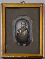 Die kleine Tochter des Arztes Dr. Bergrath (1823-1861) in Goch (Niederrhein) wurde am 27. Januar 1853 geboren und im Alter von drei Jahren daguerreotypiert. Sie kam mit einer kleinen Puppe zum Fototermin. Auf der Rückseite der Daguerreotypie findet sich eine Inschrift mit Kugelschreiber: „Maria / Gudden geb. Bergrath / geb. 27.I.1853 / Tochter des Dr / Bergrath / 3 Jahre alt“. Der Rahmen ist eine spätere Zutat. (J.V.)