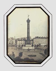 City scenery, view on a place with a large column and a statue on top of it (Paris, Place de la Bastille, Colonne de Juillet)