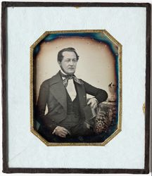 "Ein Herr mittleren Alters mit Kinnbart sitzt an einem Tisch, auf dem er seinen Unterarm abstützt. In seiner Hand hält er ein Büchlein, zwischen dessen Seiten er seine Finger gesteckt hat. Auf dem Tisch mit der stark gemusterten Decke steht ein Kelchglas, in dem eine Rosenblüte steckt. Es gibt ein zweites Porträt in der Sammlung, die offenbar die Ehefrau des Porträtierten zeigt. Als Autoren geben sich die Gebrüder Rensing zu erkennen. „Dagueréotypirt / von Gebr. Rensing.“ ist auf ihr kleines Label gedruckt, das auf der Rückseite klebt. Da sie als Wanderdaguerreotypisten unterwegs waren, lässt sich der Aufnahmeort der Daguerreotypie nicht bestimmen. Auffallend ist das mit Blumenranken geprägte Papier, aus dem das Passepartout geschnitten wurde. Eine zarte Perlstab-Papierborte rankt das Bildnis ein. (J.V.)"