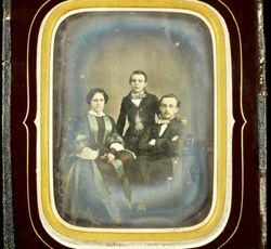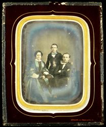 Eltern mit ihrem Sohn, der zwischen ihnen steht, Ganzfigur, koloriert.