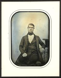 Portrait d'homme à mi-corps, assis, de face, l'avant-bras gauche posé près d'un chapeau à cylindre