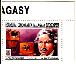 commemorative postal stamp from the Republic of Madagascar with an image of Daguerre, a daguerreotype in a passe-partou mount, a daguerreotype camera and a mercury developing box