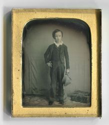 Ein kleiner Junge mit Mütze in der Hand steht vor dem Fotografen, der einen sehr provisorisch wirkenden Tuchhintergrund voller Knitter und Risse aufgespannt hat. Hinter dem Jungen ist vermutlich ein Nackenhalter platziert, dessen Fuß mit einem Sack kaschiert wurde. Auf dem Boden liegt eine Art Sitzkissen, bezogen mit einem stark gemusterten Stoff. Insgesamt wirkt die Szene sehr improvisiert. (J.V.)