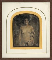 Jeune femme nue, de face, tenant une guirlande de fleurs