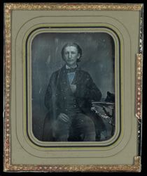 Junger Mann neben einem Tisch sitzend, auf dem seine Mütze liegt, eine Hand hat er in die Weste gesteckt, Dreiviertel.