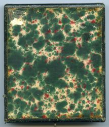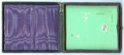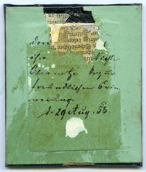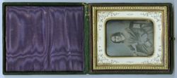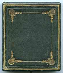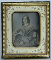 Eine junge Frau sitzt auf einem typischen Biedermeierstuhl an einem Tisch; sie hat ihren Unterarm auf dessen Platte abgelegt. Das Porträt liegt unter einem mit Pflanzenornamenten geschmückten Metallpassepartout, welches aus hauchdünnem, versilbertem Kupferblech besteht. Es ist auf eine harte Pappe aufgebracht und täuscht dadurch ein massives, ziseliertes oder graviertes Blech vor. In Wirklichkeit ist es unter hohem Druck aus ganz dünnem Material gepresst worden. Diese Art von Passepartouts ist typisch für die 1850er Jahre. Rückseitig ist die Daguerreotypie mit grünem Papier verschlossen, auf das man eine Widmung geschrieben hat. Leider ist sie nur noch fragmentarisch erhalten. Immerhin erkennbar ist: „... zur / freundlichen Erin / nerung. / d. 29. Aug. 53.“ Wahrscheinlich ist das Bildnis in zeitlicher Nähe zu diesem Übergabedatum entstanden. Es steckt in einem mit dunkelgrünem Leder überzogenen Holzetui, auf dessen Deckel goldgeprägte Linien und Ornamente angebracht sind. Die Unterseite ist hingegen glatt und wie so häufig bei europäischen Etuis nur mit Papier überzogen, in diesem Fall mit einem grün-roten Kleisterpapier. Das obligatorische Kissen im Deckel besteht aus violetter Moiréseide, während der Platz unter der Daguerreotypie mit grünem Papier ausgeschlagen ist. (J.V.)