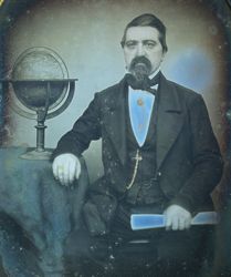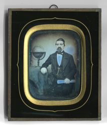 Ein bärtiger, grimmig blickender Mann sitzt an einem Tisch, auf dem man zur Charakterisierung des Dargestellten einen Globus platziert hat. Vielleicht handelt es sich um einen Geograph, oder aber auch um einen Hersteller von Globen. Während der Fotograf die Tischdecke blau kolorierte, entstanden die Blaufärbungen auf der Hemdbrust und auf der Schriftrolle durch Solarisation, d.h. durch Überbelichtung. Die Uhrkette, der Fingerring und der Schmuck auf der Hemdbrust wurden mit Muschelgold bemalt. (J.V.)