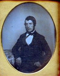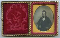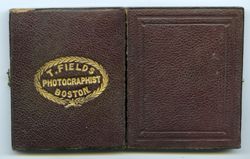 Das Bildnis eines Herrn entstand in der englischen Stadt Boston in der Grafschaft Lincolnshire. Der auf dem Deckel mittels goldgeprägtem Logo genannte Daguerreotypist T. Fields ist ein unbeschriebenes Blatt in der englischen Fotogeschichte. Während das Etui äußerlich sehr schlicht gehalten ist, verrät das reich geschmückte Innere eine Entstehung in den 1850er Jahren. (J.V.)