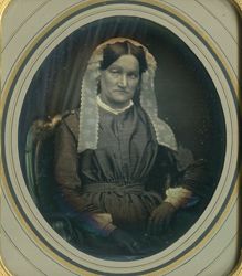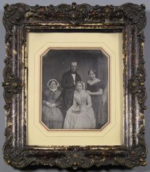 Urgroßmutter Matthiessen (links sitzend), Großmutter Prale geb. Matthiessen (rechts sitzend), Großvater Prale (stehend) Tante Sophie Scheel (stehend) wurden durch den Hamburger Daguerreotypisten Carl Ferdinand Stelzner in einer pyramidalen Komposition abgelichtet. Sein gelbes Label klebt auf der Rückseite: „DAGUERREOTYP / von / Stelzner / Portraitmaler. / Jungfernstieg No.11 / HAMBURG.“ Gefasst ist die großformatige Platte in einem Stuckrahmen mit Rokoko-Ornamentik. Das rückseitige Label weist die Adresse Jungfernstieg 11 auf, die Stelzner ab November 1844 inne hatte. Zur Datierung lässt sich generell anmerken, dass Stelzner ab ca. 1850 andere Ausschnittformen und Passepartouts bei seinen Daguerreotypien bevorzugte. Der oktogonale Ausschnitt mit dem kupferfarbigen Linienaufdruck gehört in die zweite Hälfte der 1840er Jahre. Das früheste Beispiel ist eine 1845 entstandene Daguerreotypie im National Media Museum, Bradford, United Kingdom (Idendification 1990-5037_A.28). (J.V.)