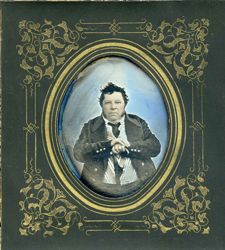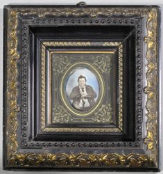 In einem prächtigen, schwarz-goldenen Rahmen mit Stuckverzierung ist eine Daguerreotypie befestigt, die einen korpulenten Herrn mit starken Koteletten zeigt. Mit beiden Händen stützt er sich auf seinen Stock. Es handelt sich um Christian Gottlieb Ziegler aus der kleinen thüringischen Bergstadt Ruhla, die nicht nur durch ihre Uhrenherstellung bekannt wurde, sondern im 18. und 19. Jahrhundert auch eine bescheidene Rolle als Kurort spielte. Als die Daguerreotypie entstand, war diese Blüte allerdings schon vorbei. (J.V.)