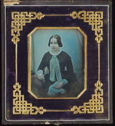 Junge Frau mit weißer Halsschleife und einem weißen Tuch in der Hand am Tisch sitzend, Halbfigur, koloriert.