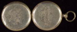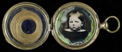 Brustbild eines Kindes mit schulterfreiem Kleid, im Gehäusedeckel befindet sich eine blonde Haarlocke.