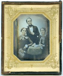 An einem kleinen Tisch sitzen zwei Frauen, von denen die eine ihr Tuch und ein Buch, die andere nur ihr Tuch hält. Zwischen den beiden steht ein Mann, der seine Hand ins Revers der Jacke geschoben und die andere wohl an der Lehne des Stuhles aufstützt hat, auf dem die linke Frau sitzt. Zur Daguerreotypie gehört ein stuckverzierter Rahmen. (J.V.)