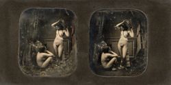 Academic study, two naked woman, one sitting on the ground, one standing and holding a music instrument