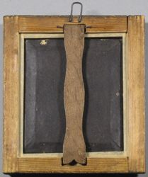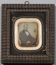 Das Bildnis eines Mannes wurde in einem Flammleisten-Rahmen mit rückwärtiger, ausklappbarer Stütze gefasst, wie er mehrmals für den Kölner Daguerreotypisten Burbach nachgewiesen ist. Burbach verwendet hier einen gemalten Hintergrund, auf dem ein Podest mit Tafelaufsatz zu sehen ist. (J.V.)