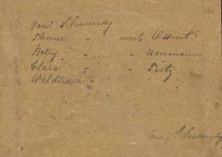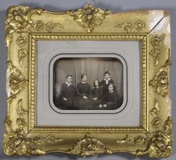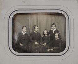 Vor einem Vorhang haben sich die Schwendy-Geschwister aufgereiht, drei Mädchen und zwei Jungen: „Paul Schwendy / Therese Schwendy vereh. Ossent / Betty Schwendy vereh. Neumann / Clara Schwendy vereh. Tietz / Waldemar Schwendy“ lautet die Inschrift auf der Rückseite der Daguerreotypie. Alle berühren sich mehr oder weniger, wodurch zum einen dem Wackeln vorgebeugt, zum anderen auch Geschwisterliebe angezeigt wird. Die Daguerreotypie, die vielleicht aus der Familie des Berliner Malers Albert Schwendy (1820-1902) stammt, ist in einem reich verzierten Rahmen untergebracht. In damals typischer Manier ist das Holz des Rahmens mit geprägtem Papier und mit Stuckornamenten belegt und anschließend bronziert worden. (J.V.)