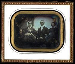 Familie, Eltern mit drei Kindern. Die Eltern sitzen in der Mitte, die Mutter hat das Jüngste auf dem Schoß, das sich wegdreht, links neben ihr sitzt ein weiteres kleines Kind, der älteste Sohn sitzt rechts neben dem Vater, Dreiviertel.