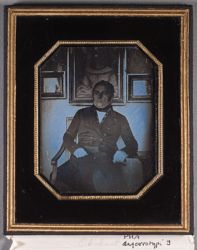 Portrait of Director Anton Jaenisch (1800-1861) sitting on a chair, paintings on the wall on the back ground.