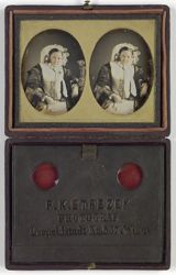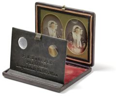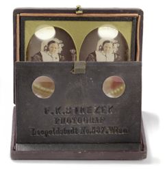 "Unbekannte Frau in reicher Tracht. 3/4-Figur sitzend zwei stereoskopische Hochoval-Daguerrotypien, bez. Strezek's Daguerrotyp-Atelier Wien, Leopoldstadt 587 in Lederetui mit zwei Stereoskoplinsen Firmenbezeichnung eingeprägt: F. K. Strezek/Photograph/Leopoldstadt No. 587. Wien"