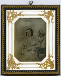 Eine junge Frau sitzt an einem Holztisch, auf dem eine sehr markante Vase steht. Dieses Gefäß kommt auf einem Selbstbildnis des Göttinger Daguerreotypisten Phillipp Petri vor und könnte aus dessen Porzellanmalwerkstatt stammen, die er ebenfalls betrieb. Eine mit gleichem Passepartout versehene Daguerreotypie Petris, die sich ebenfalls in der Sammlung W. befindet (Daguerreobase, Sammlung W., Identification d0272), trägt rückseitig die Datierung „1841-42“. Sicherlich muss man für das hier vorgestellte Bildnis auch eine zeitliche Einordnung in die 1840er Jahre vornehmen. (J.V.)