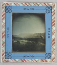 A landscape scene with hilly background, showing Ross' wife in the foreground to the right, shooting a rifle at a stag, whose antlers are visible on the left. She wears a bonnet and bodice, the lower half of her costume is not visible.
