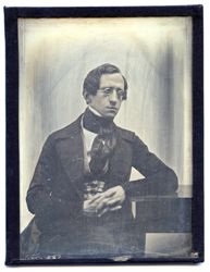 "Das einzige bekanntgewordene Bildnis des Göttinger Gelehrten Himly aus der Daguerreotypieära zeigt den Porträtierten an einem einfachen Tisch sitzend, wie in Gedanken versunken, die Hände verschränkt. Da die originale Fassung abhanden kam, wird der Plattenstempel sichtbar: „40 GARANTIE G.R.B.“ (J.V.) „Himly wurde als Sohn des Augenarztes Karl Gustav Himly (1772-1837) geboren. Himly studierte um 1834 an der Universität Göttingen bei Friedrich Stromeyer und promovierte 1835 zum Dr. phil. und wurde 1837 in Göttingen Privatdozent. Am 30. Juni 1842 wurde er als außerordentlicher Professor an die Universität Kiel berufen und dort am 13. März 1846 zum ordentlichen Professor der Chemie ernannt. Sein Labor war in einem angemieteten Haus untergebracht und in einem erbärmlichen Zustand.