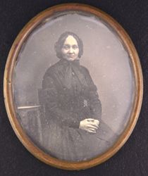 Portrait einer sitzenden Frau mit schwarzer Halsschleife.