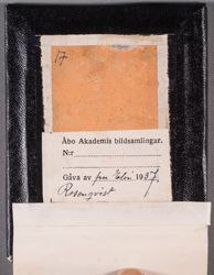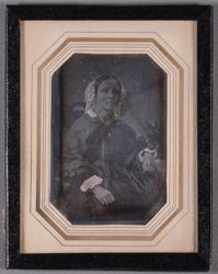 Portrait of a married woman sitting on a chair. Flowers on a side table.