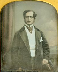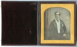Neben einem Vorhang steht ein jüngerer Mann in eleganter Kleidung, der sich auf die Lehne eines Atelierstuhles stützt. Er posiert vor einer Balustrade, hinter der sich ein Blick in die weite Landschaft auftut. Am Himmel sind dramatische Wolken einkoloriert, eine Spezialität vieler englischer Daguerreotypisten. Das Bildnis im Format der „halben Platte“ befindet sich in einem Etui, welches mit rotbraunem, genarbtem Leder überzogen und auf dem Deckel mit Claudets Label goldgeprägt ist: „MR. CLAUDET / 107 REGENT STREET“. Zwischen beiden Zeilen ist das Wappen des Vereinigten Königreichs eingeprägt, denn Claudet durfte sich seit 1853 Hoffotograf der englischen Königin nennen. Er hatte in diesem Jahr zahlreiche Porträts von Mitgliedern des Königshauses aufgenommen. Das Wappen wird vom Löwen Englands und vom Einhorn Schottlands gehalten, darunter ist der Wahlspruch der Monarchie angebracht: „Dieu et mon droit“ (franz. Gott und mein Recht). (J.V.)