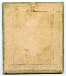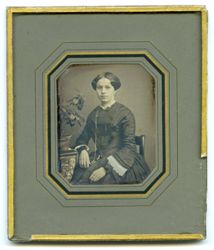 Auf einem Seitenrahmenstuhl des Biedermeier sitzt ein jungen Frau in dunklem Seidenkleid an einem Tisch mit stark ornamentierter Tischdecke. Auf dem Tisch steht ein Blumentopf mit großblättriger Pflanze bzw. liegt ein Buch. (J.V.)