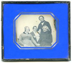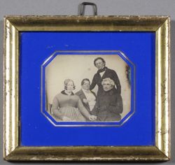 n lockerer Runde haben sich mehrere Personen zusammengefunden: Eine korpulente Frau in einfachem Kleid und ein weißhaariger Mann, der seinen Arm in Napoleon-Manier („kontrolliert und besonnen“) in die Jacke gesteckt hat, geben sich als Paar zu erkennen, denn sie fassen sich bei den Händen. Mittig hinter ihnen sitzt ein beleibter Herr und rechts im Bild steht ein weiterer, schlanker Mann. Offensichtlich sind sie alle sehr gut miteinander bekannt. Die Daguerreotypie liegt unter einem schlichten Passepartout aus leuchtend blauem Papier mit silbernem Liniendekor, wie man es gern in den 1840er Jahren benutzt hat. Eine sogenannte „Berliner Leiste“, d.h. ein einfaches blattversilbertes Profil, rahmt die Daguerreotypie ein. (J.V.)