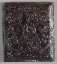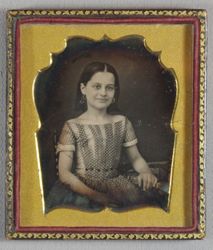 Half length portrait of a girl with dark, straight hair, seated facing forward, her left arm resting on a small circular table covered with a patterned cloth. She wears a short-sleeved dress with a repeating leaf-like pattern of dark and paler stripes. There is whiter braid-like edging at the end of the sleeves, but not around the neckline: this is low, almost off the shoulder. Dark 'buttons' are visible at the waist. She is smiling. She wears gold-highlighted gold hoop earrings and a ring on the third finger of her left hand. Lightly hand-coloured.