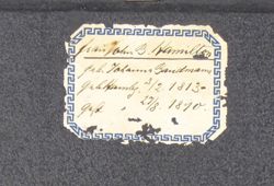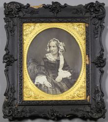 „Frau John B. Hamilton / geb. Johanna Bandmann / geb. Hambg. 3/2 1813 / gest. Hambg. 27/8 1890“, verrät die mit brauner Tinte geschriebene Nachricht auf der Rückseite der Daguerreotypie. Frau Hamilton sitzt auf einem mondänen Rokokosessel und stützt ihren Arm auf eine Tischplatte. Das Bildnis liegt unter einem mit Pflanzenornamenten geschmückten Metallpassepartout, welches aus hauchdünnem, vergoldetem Kupferblech besteht. Es ist auf eine harte Pappe aufgebracht und täuscht dadurch ein massives, ziseliertes oder graviertes Blech vor. In Wirklichkeit ist es unter hohem Druck aus ganz dünnem Material gepresst worden. Diese Art von Passepartouts sind typisch für die 1850er Jahre. (J.V.)