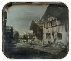 Vue des maisons d’habitation bordant l’Untere Gasse sur le côté sud, Meiringen. [Vue inversée]