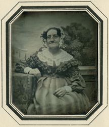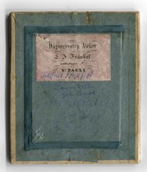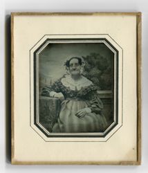 "An einen Tisch, mit dem Arm auf die Tischplatte gestützt, sitzt eine alte Dame direkt an einer Brüstung, hinter der ein gemalter Plafond hängt. Kräftiges Buschwerk im Vordergrund und ein weit entfernter Anstieg mit drei Pappeln sind die wesentlichen Motive des Bildes. Auf der Tischdecke wird eine barocke Kirche sichtbar. Urheber des Porträts ist der Hamburger Daguerreotypist L. J. Fränkel, dessen Label sich auf der Rückseite befindet: „Daguerreotyp-Atelier / von / L. J. Fränkel / Spielbudenplatz No.3 / ST. PAULI“.