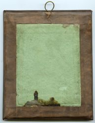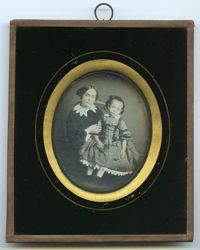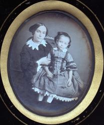 Eine junge Frau, die auf einem gepolsterten Ateliersessel sitzt, hat ein Mädchen auf ihrem Schoß platziert, bei dem es sich wahrscheinlich um ihre Tochter handelt. In spannendem Kontrast steht das dunkle Kleid der Mutter zu dem vertikal gestreiften Kleid des Kindes. Die Fassung der Daguerreotypie verweist auf die 1850er Jahre. (J.V.)