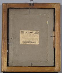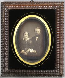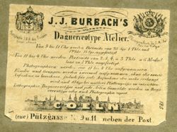 Ein bärtiger Herr und seine Frau stehen vor der Kamera, der Herr hält ein kleines aufgeschlagenes Buch. Gefasst ist die Daguerreotypie des Kölner Fotografen Burbach unter einem schwarzen Deckglas mit Goldlinie. Außerdem befindet sich das Objekt in einem Flammleistenrahmen, wie ihn Burbach gern verwendet hat. Rückseitig ist das Atelierlabel mit umfangreichem Text aufgeklebt: „J. J. Burbach’s / Daguerreotype Atelier / Von 9 bis 11 Uhr werden Portraits von 20 Sgr, 1 Thlr. und / 1 Thlr. 15 Sgr. angefertigt. / Von 11 bis 4 Uhr werden Portraits von 2, 3, 4, 6 und 10 Thlr. u. 6 Medaillons / zu 3 Thlr. angefertigt. / Photographien werden von 11 bis 4 Uhr aufgenommen. / Kinder und Gruppen werden zweimal aufgenommen, ohne die zweite Aufnahme zu berechnen, jedoch für jede Aufnahme die mehr verlangt wird sind 10 Sgr. bei / mittlerer Plattengröße zu entrichten. / Lithographie Daguerreotype und jede Art Gemälde werden in Daguerreotype oder auch Photographie copirt. / Pützgasse No. 9 u 11 neben der Post.“ (J.V.)