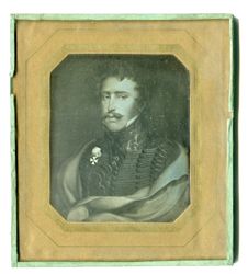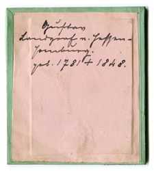 „Gustav war der vierte Sohn von Landgraf Friedrich V. und seiner Frau Karoline von Hessen-Darmstadt, einer Tochter des LandgrafenLudwig IX. von Hessen-Darmstadt und Henriette Karoline von Pfalz-Zweibrücken, der großen Landgräfin. 1787 wurde er von seinem Taufpaten, dem schwedischen König Gustav III., zum Gardeleutnant ernannt. Mit 17 Jahren trat er dann in schwedische Dienste. Es bestanden ja noch von Friedrich II. her gute Beziehungen zum schwedischen Königshaus. Nach der Ermordung des Königs bat er um Entlassung aus dem schwedischen Dienst und kehrte nach Homburg zurück. Sein Bruder Friedrich diente bereits im österreichischen Heer, also war es naheliegend, dass er ebenfalls dort eintrat. Von 1846 bis zu seinem Tode 1848 war er Landgraf von Hessen-Homburg. Prinz Gustav heiratete am 12. Februar 1818 in Dessau seine Nichte Louise Friederike von Anhalt-Dessau, die Tochter seiner Schwester Amalie.“ (Wikipedia) Die rückseitige Beschriftung der Daguerreotypie erfolgte um 1900 durch den schwarzburg-rudolstädter Hofsekretär Oskar Vater (1861-1954). (J.V.)