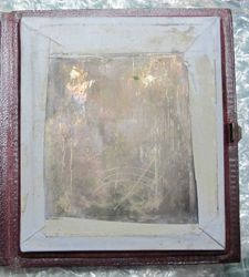 Beautifully tinted three quarter length portrait of seated woman at nearby table with vase of flowers. Painted background with clouds.