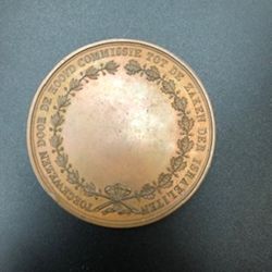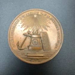 "VZ: Een brandend altaar versierd met een davidster. Links daarvan een anker, rechts twee wetstafels. Op de voorgrond een liggende wetsrol. Omschrift: OVEREENKOMSTIG ZIJNER MAJESTEITS BESLUIT VAN 17 OCTOBER 1827. No 184. KZ: Binnenin door een lint samengebonden lauer- en eiketak is er een ruimte voor inscriptie. Omschrift: TOEGEWEZEN DOOR DE HOOFD COMMISSIE TOT DE ZAKEN DER ISRAËLITEN."