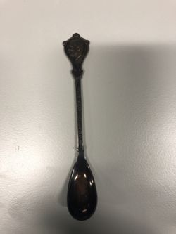 Zilverkleurige lepel met een glad, ovaal blad. De steel is recht met aan de zijranden een opstaande rand, met onderaan een krul. Op de steel staat de tekst: prins Claus. De spadel heeft een sleutelgat vorm met onderaan een hartvorm. Op de spadel staat in basreliëf een portret en profiel naar rechts van Claus. Bovenop de spadel staat een kroon. Links en rechts naast de kroon zit een krulmotief. De achterkant van de lepel is glad. De lepel zit met nog 3 andere lepels, waar het een serie mee vormt, in een witte doos met bruine bloemen en een doorzichtige plastic deksel.