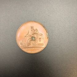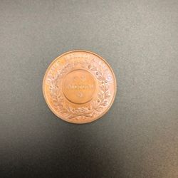 "VZ: Een vrouw met stedekroon in antieke kleding zit tegen een altaar met gekroond wapen van Den Haag. Zij heeft en palmtak in de rechterhand. Aan haar voeten attributen van de kunst: een lier, palet met penselen, lineaal, driehoek, hamer en en nijptang. Achter haar een antiek roer. In de afsnede het opschrift in één regel: EX.S(enatus).C(onsulto).CIV(itatis).HAGANAE (Volgens raadsbesluit van de Gemeente Den Haag). KZ: Binnen door een lint samengebonden eiken- en oranjetak een cirkel met opschrift in drie regels: N.(on).N(ominando). / PICTORI / N. (Aan N., de niet nadergenoemde schilder). Halfomschrift: OPTIME.MERITO.ARTIFICI (Aan de meest verdienstelijke kunstenaar)."
