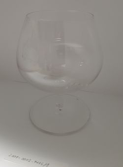 "Cognacglas van het stadhuisservies Den Haag. Centraal staat het logo van de stad: een ooievaar met een aaltje in zijn bek, afgebeeld tegen een schild en bekroond met een kroon, links en rechts geflankeerd door een leeuw. Het servies van de gemeente Den Haag, heeft naast verschillende types glazen ook dessertborden, ontbijtborden, diepe borden, grote borden, kopjes met schotel."