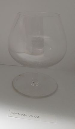 "Cognacglas van het stadhuisservies Den Haag. Centraal staat het logo van de stad: een ooievaar met een aaltje in zijn bek, afgebeeld tegen een schild en bekroond met een kroon, links en rechts geflankeerd door een leeuw. Het servies van de gemeente Den Haag, heeft naast verschillende types glazen ook dessertborden, ontbijtborden, diepe borden, grote borden, kopjes met schotel."
