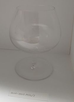 "Cognacglas van het stadhuisservies Den Haag. Centraal staat het logo van de stad: een ooievaar met een aaltje in zijn bek, afgebeeld tegen een schild en bekroond met een kroon, links en rechts geflankeerd door een leeuw. Het servies van de gemeente Den Haag, heeft naast verschillende types glazen ook dessertborden, ontbijtborden, diepe borden, grote borden, kopjes met schotel."