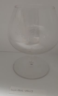 "Cognacglas van het stadhuisservies Den Haag. Centraal staat het logo van de stad: een ooievaar met een aaltje in zijn bek, afgebeeld tegen een schild en bekroond met een kroon, links en rechts geflankeerd door een leeuw. Het servies van de gemeente Den Haag, heeft naast verschillende types glazen ook dessertborden, ontbijtborden, diepe borden, grote borden, kopjes met schotel."